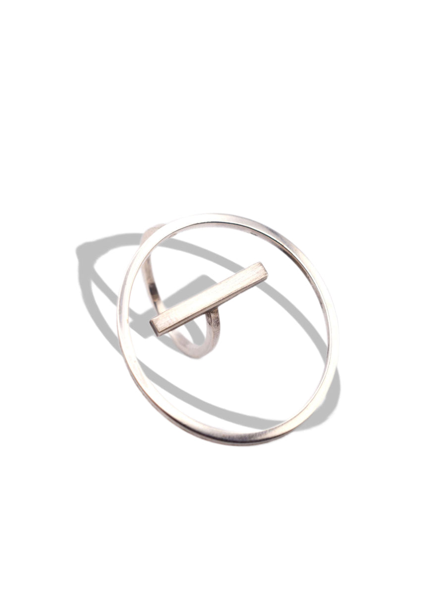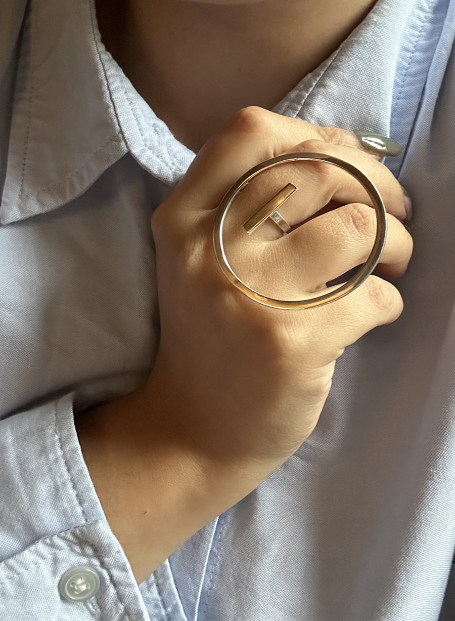 E’ un anello dalle forme geometriche creato con un cerchio e una retta realizzato a mano a Napoli da abili artigiani. È perfetto per un look minimal chic.