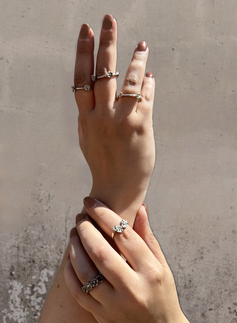 Porta la primavera sempre con te con questo bellissimo anello in argento, in cui ogni fiore viene realizzato totalmente a mano esclusivamente per te. Questi raffinati gioielli rappresentano la rinascita e la vitalità della primavera.