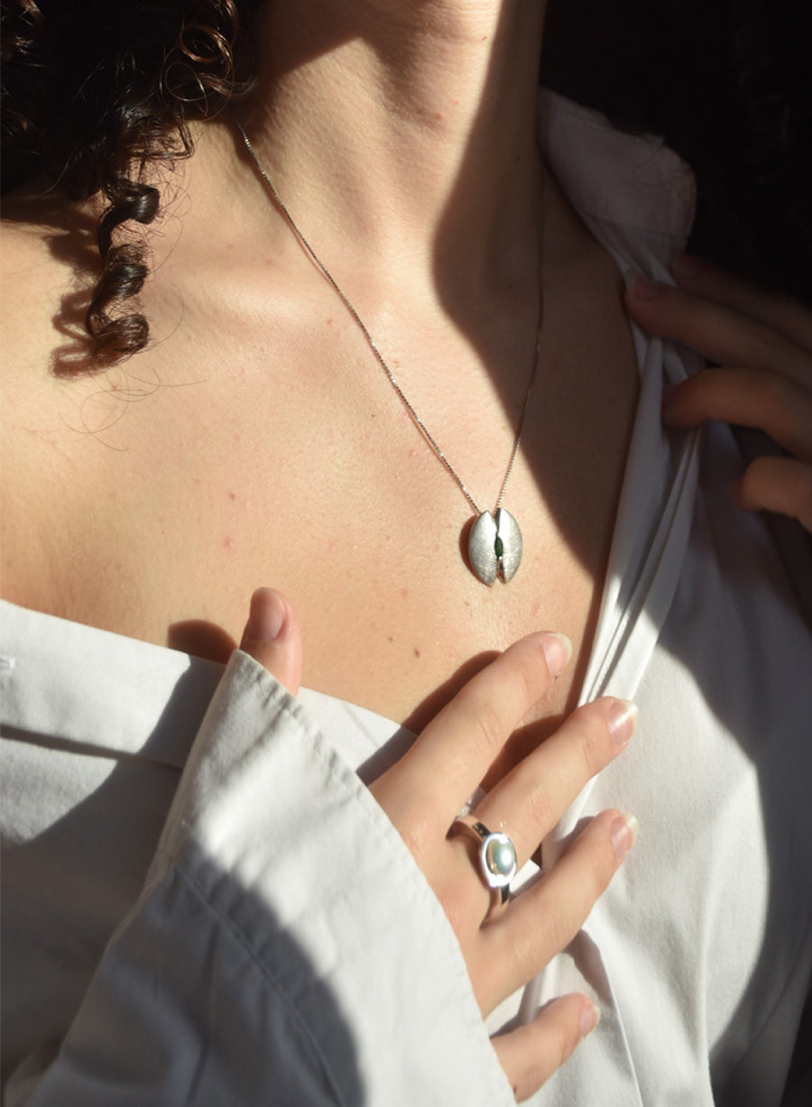 Il ciondolo Afrodite incarna la poesia di una conchiglia nella sua forma più essenziale e pura.