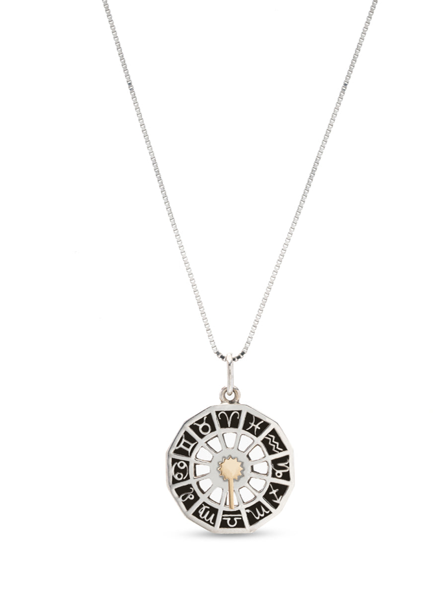 Illumina il tuo percorso con il nostro ciondolo Zodiaco, un gioiello unico, finemente realizzato in argento, che vede tutti i segni dello zodiaco ruotare attorno a un sole centrale.