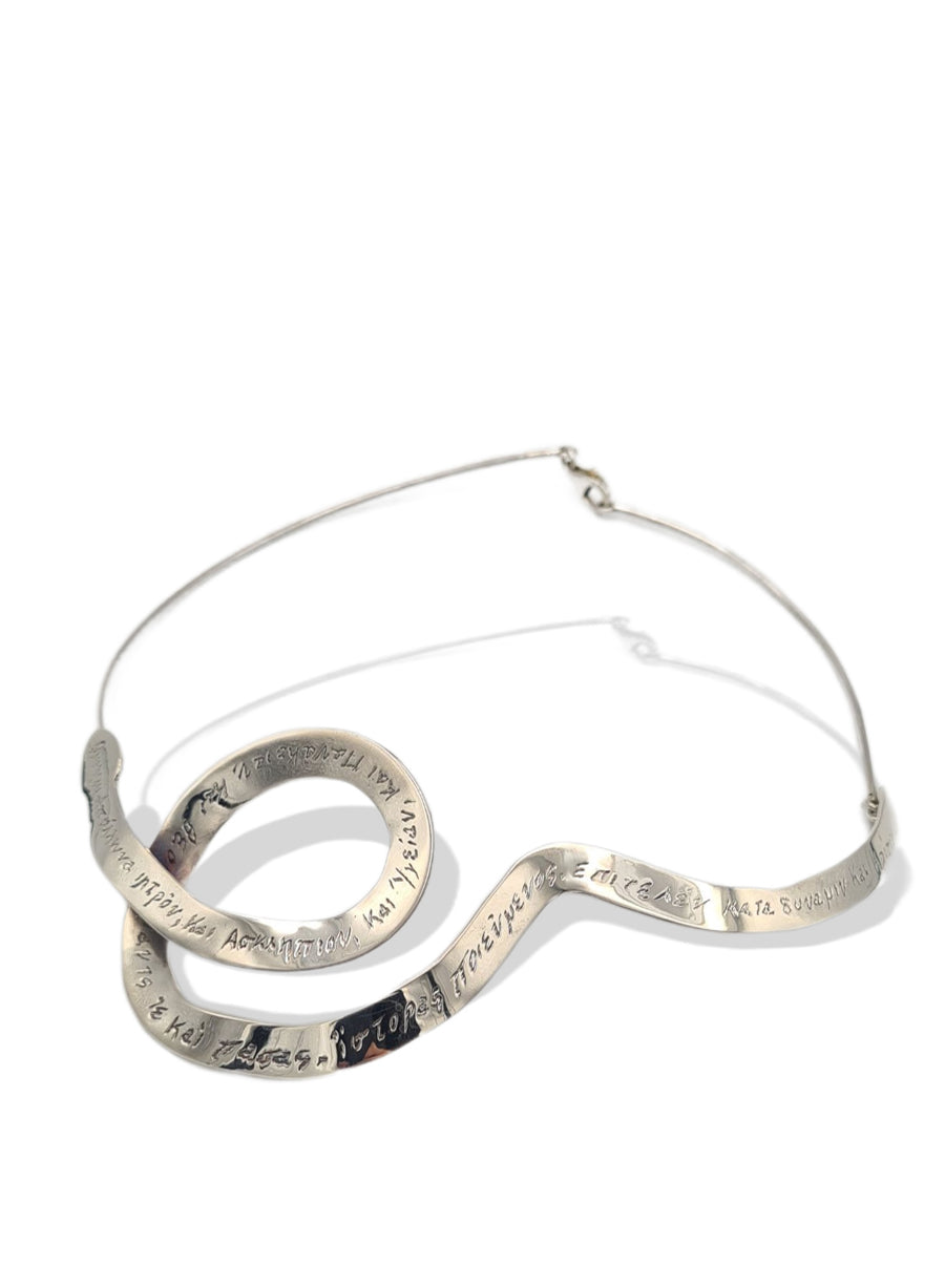 Minuziosamente realizzata a mano in Argento 925, la collana si distingue per la sua forma elegante, piatta e sinuosa, che richiama il movimento ipnotico del serpente.