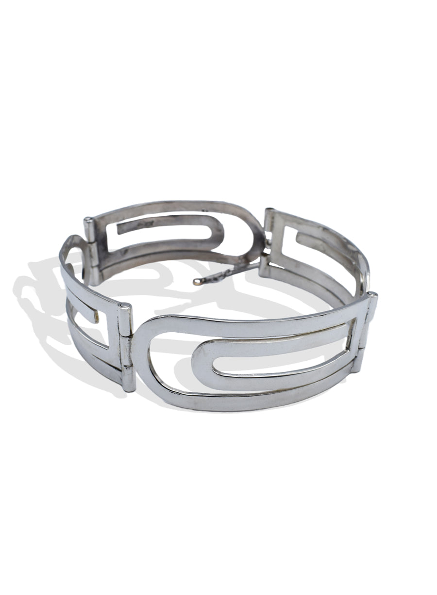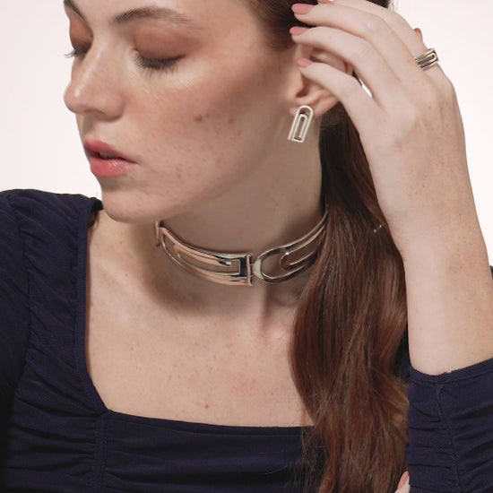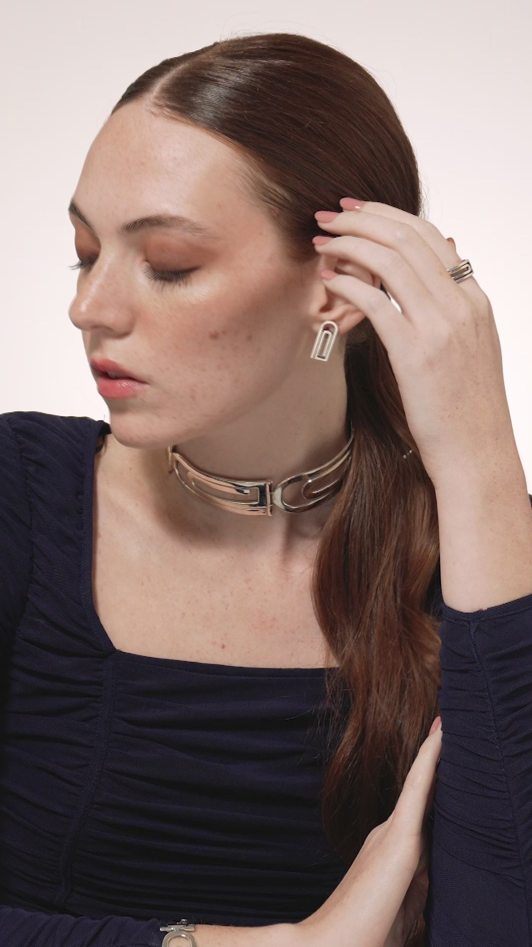 Le graffette modulari che compongono il girocollo richiamano quelle geometrie perfette, trasformando un oggetto comune in un gioiello essenziale e scultoreo.