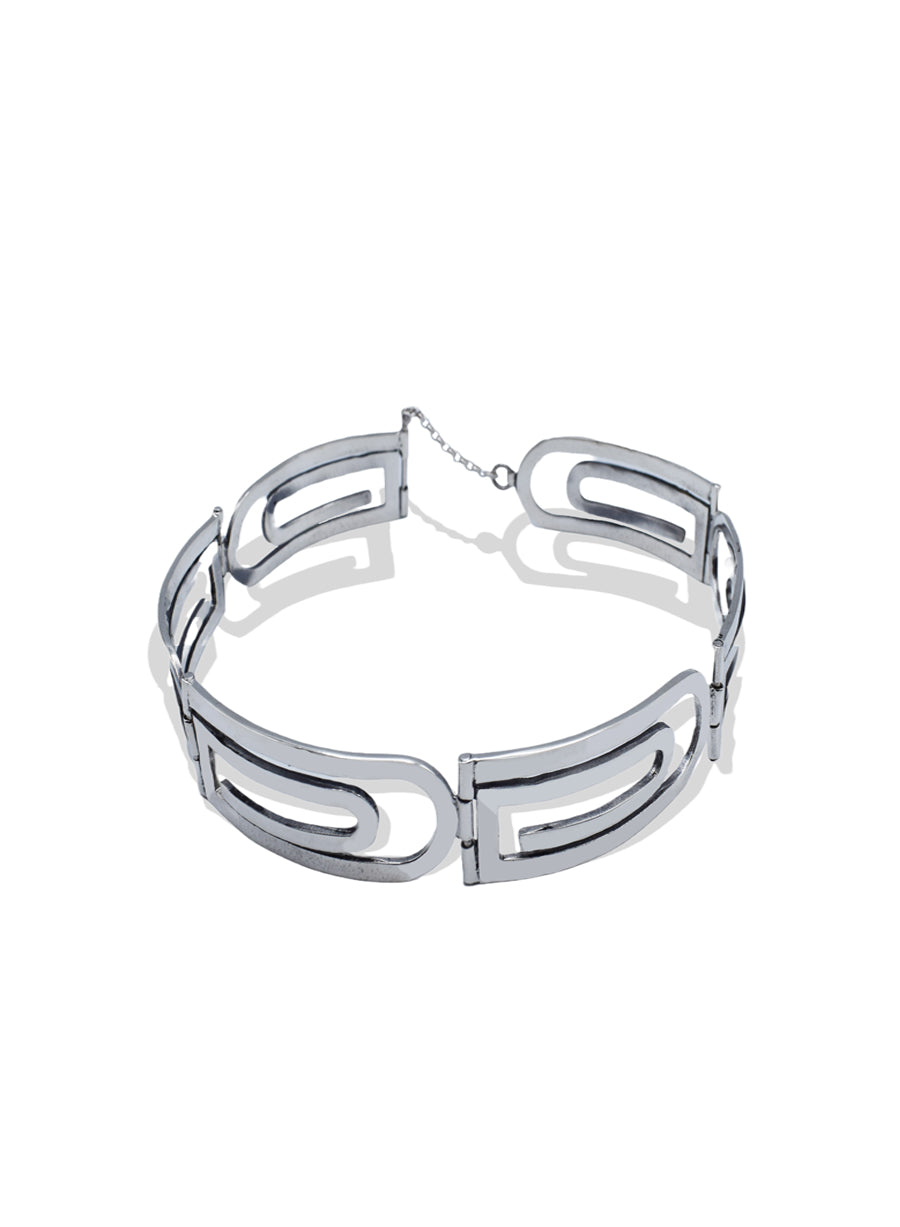 Le graffette modulari che compongono il girocollo richiamano quelle geometrie perfette, trasformando un oggetto comune in un gioiello essenziale e scultoreo.
