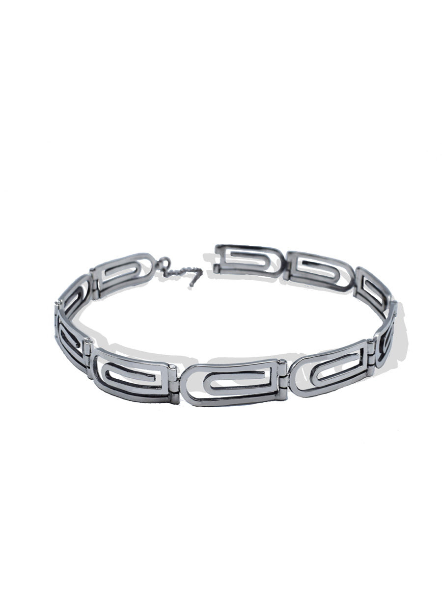 Le graffette modulari che compongono il girocollo richiamano quelle geometrie perfette, trasformando un oggetto comune in un gioiello essenziale e scultoreo.