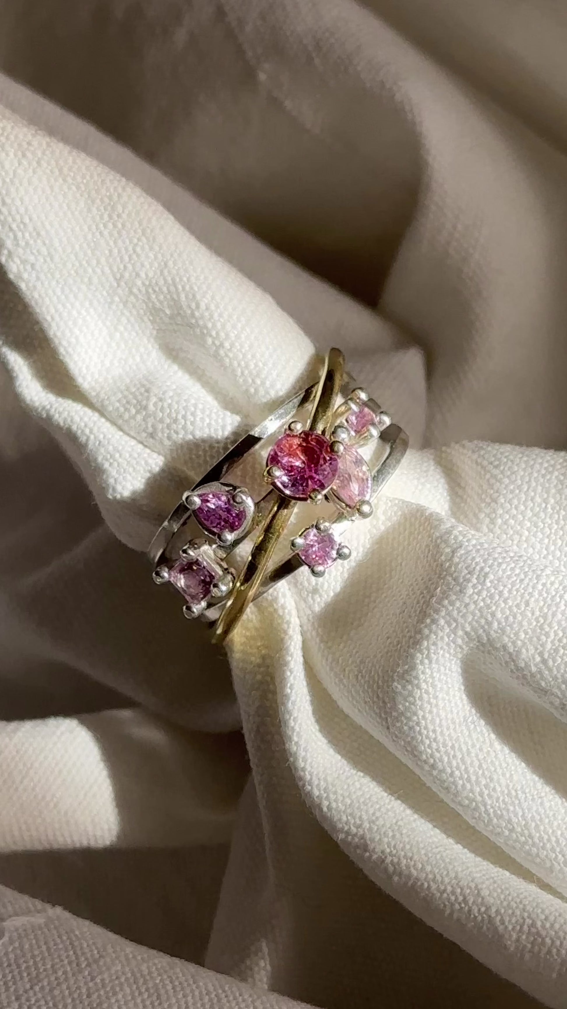 Pietre Uniche: Sei Zaffiri Rosa naturali brillano con tagli completamente diversi (Brillante, Goccia, Princess, Navetta...), una rarità che rende ogni anello assolutamente unico e irripetibile (Zaffiro centrale da 0,48ct). Proprio come non esistono due stelle identiche, non esistono due anelli Andromeda uguali.